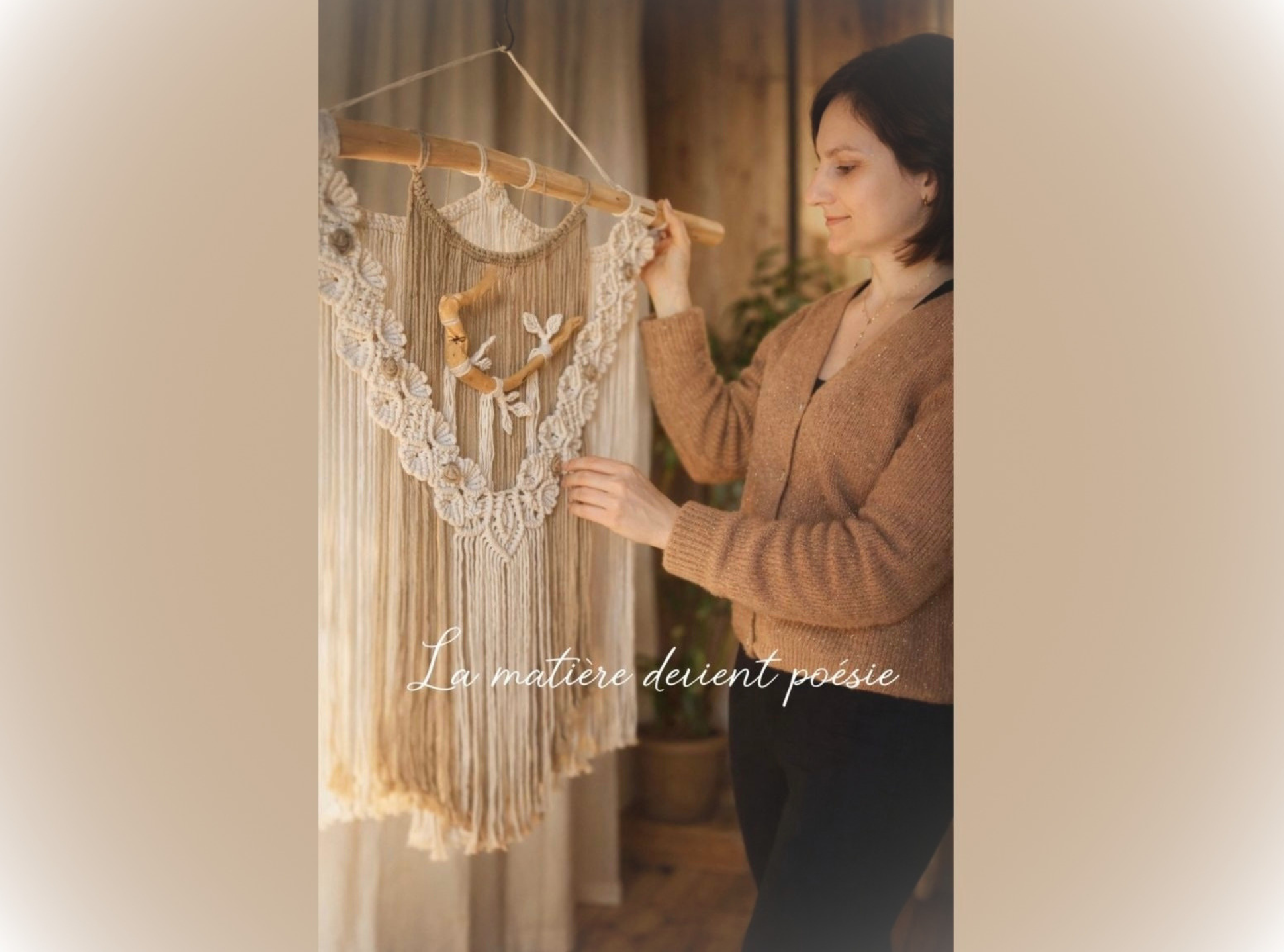 Bienvenue dans mon univers dédié à l’artisanat d’art et à la décoration bohème. Je crée pour vous des macramés muraux faits main, conçus avec passion dans mon atelier. Chaque pièce est réalisée à partir de matières de haute qualité comme le coton recyclé Bio certifié et le bois.