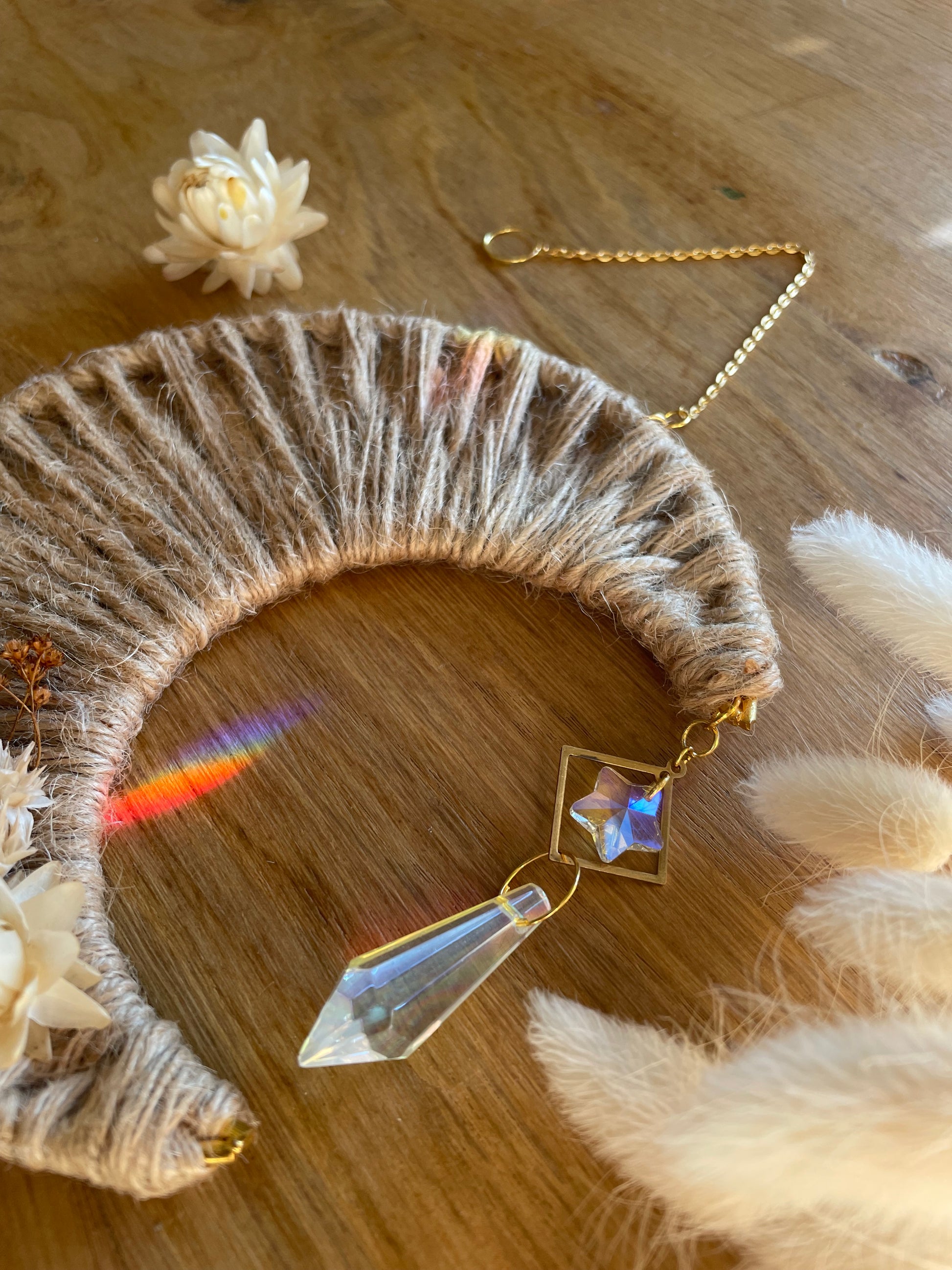 Apportez une touche de poésie et de lumière à votre intérieur avec cet attrape-soleil artisanal unique. Tissé à la main en forme de lune, il est réalisé en jute naturelle et délicatement orné de fleurs séchées pour une ambiance bohème et douce. Son bijou suspendu, composé de deux sublimes perles en verre facetté, capte la lumière et diffuse de jolis reflets solaires dans votre pièce.