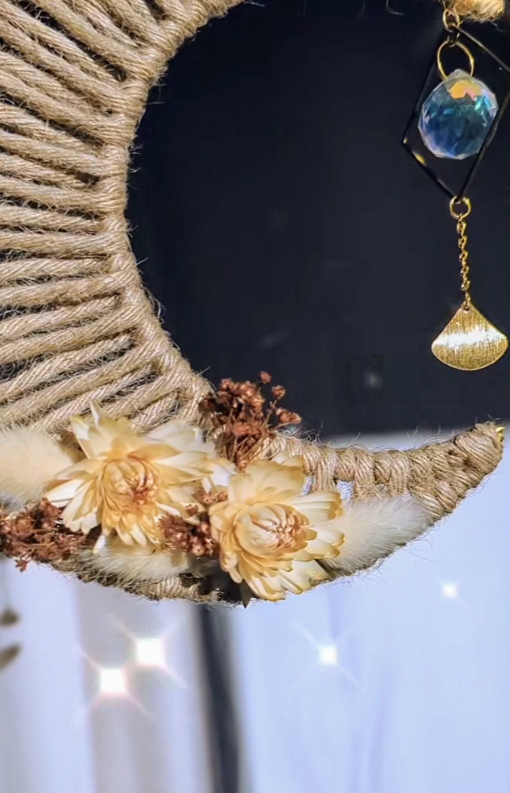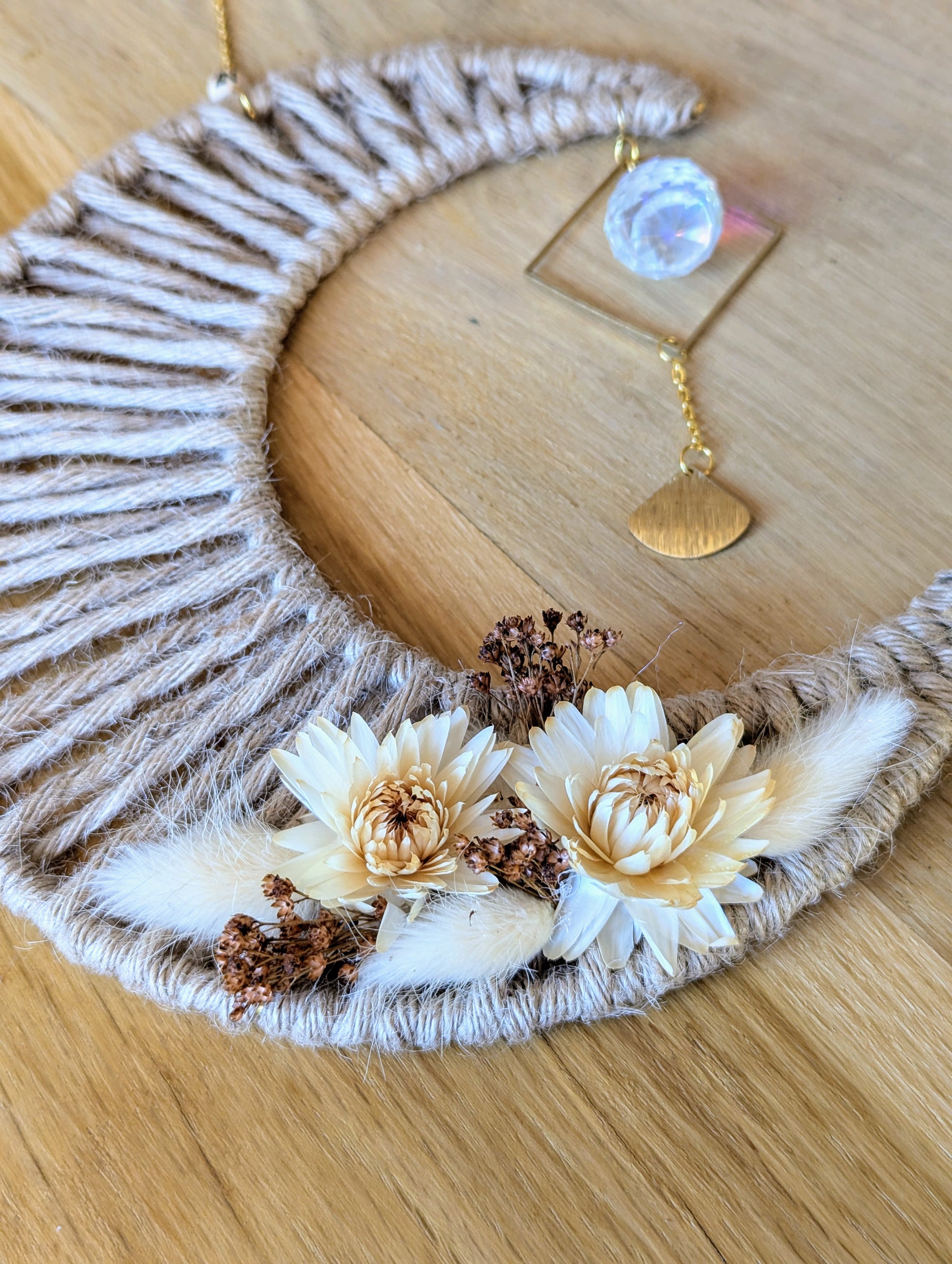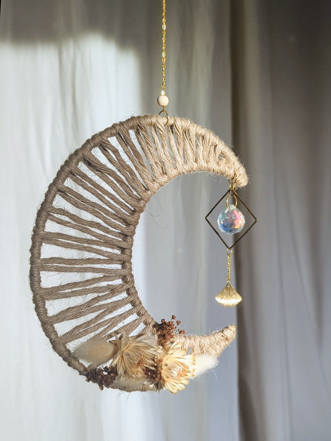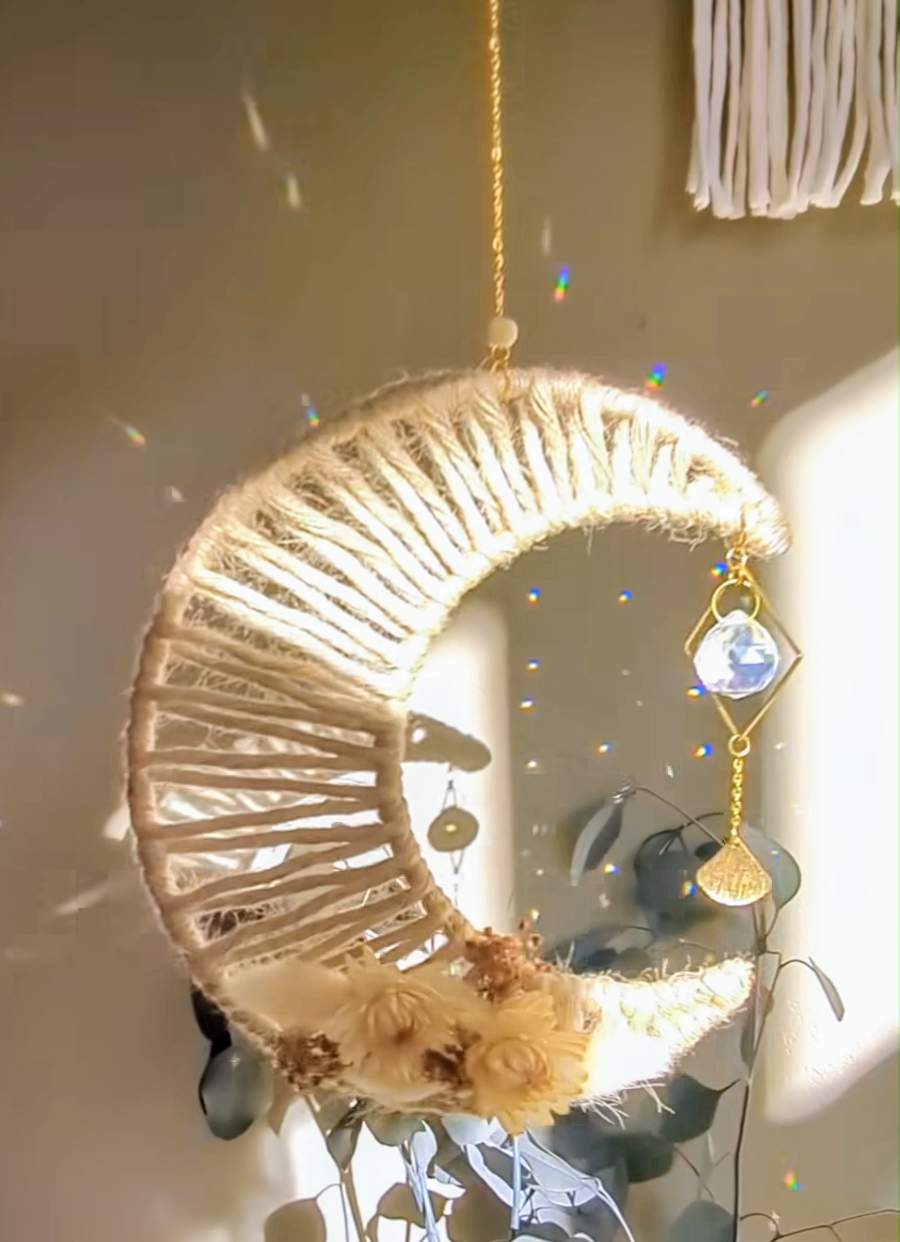 Sa forme de lune tissée évoque la sérénité des nuits étoilées, tandis que chaque fleur soigneusement fixée à la main apporte une touche bohème et romantique. Placé devant une fenêtre, "Bella" capte la lumière grâce à sa perle en verre facetté et diffuse une atmosphère apaisante, idéale pour un coin lecture, une chambre ou une pièce à vivre.