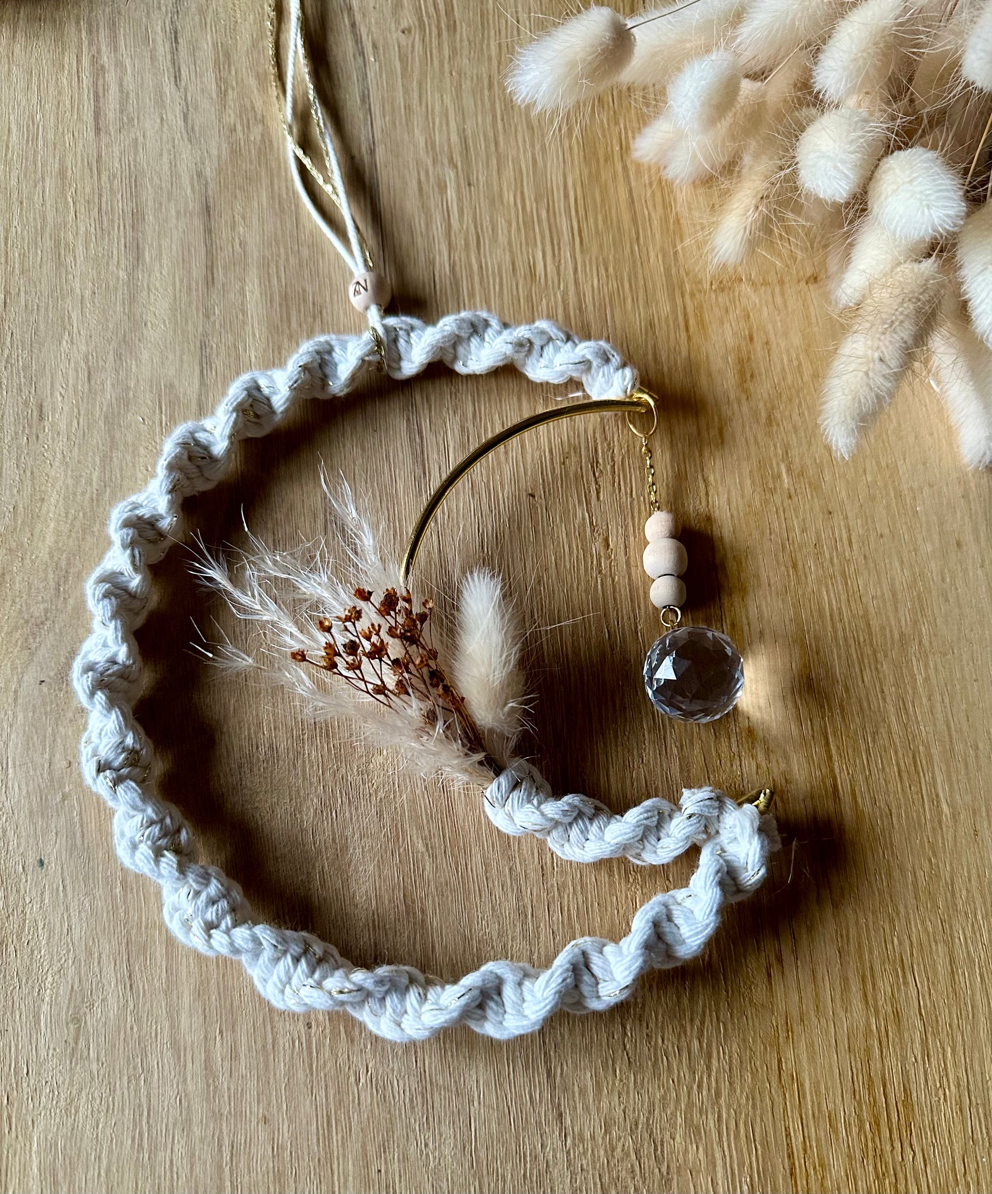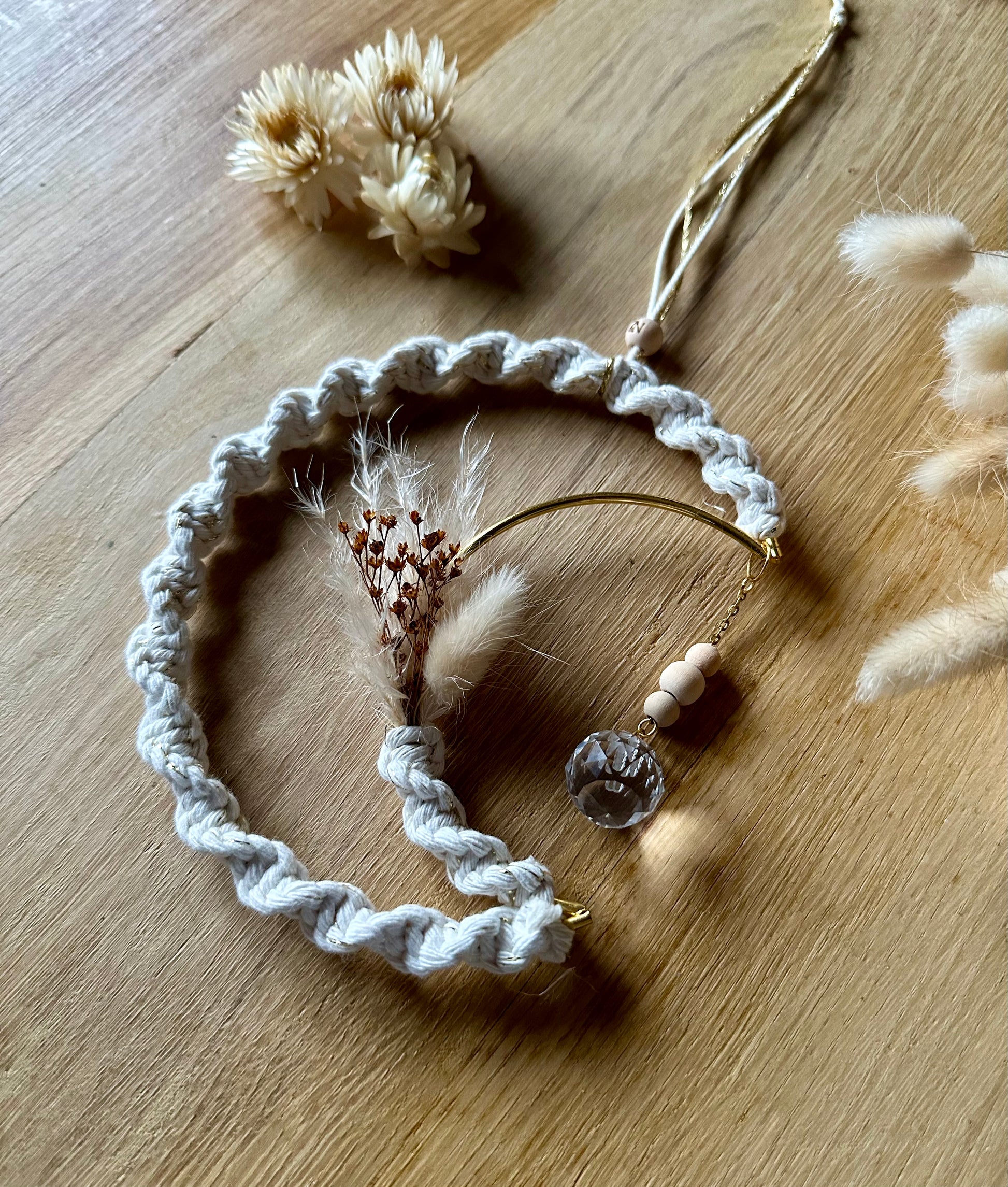 Apportez une touche de poésie et de douceur à votre intérieur avec notre attrape-soleil en forme de lune. Ce délicat objet de décoration capte la lumière et les regards grâce à ses détails soigneusement travaillés : une élégante torsade en macramé, un bouquet de fleurs séchées soigneusement sélectionnées et une perle en verre facetté qui reflète les rayons du soleil en une danse scintillante.