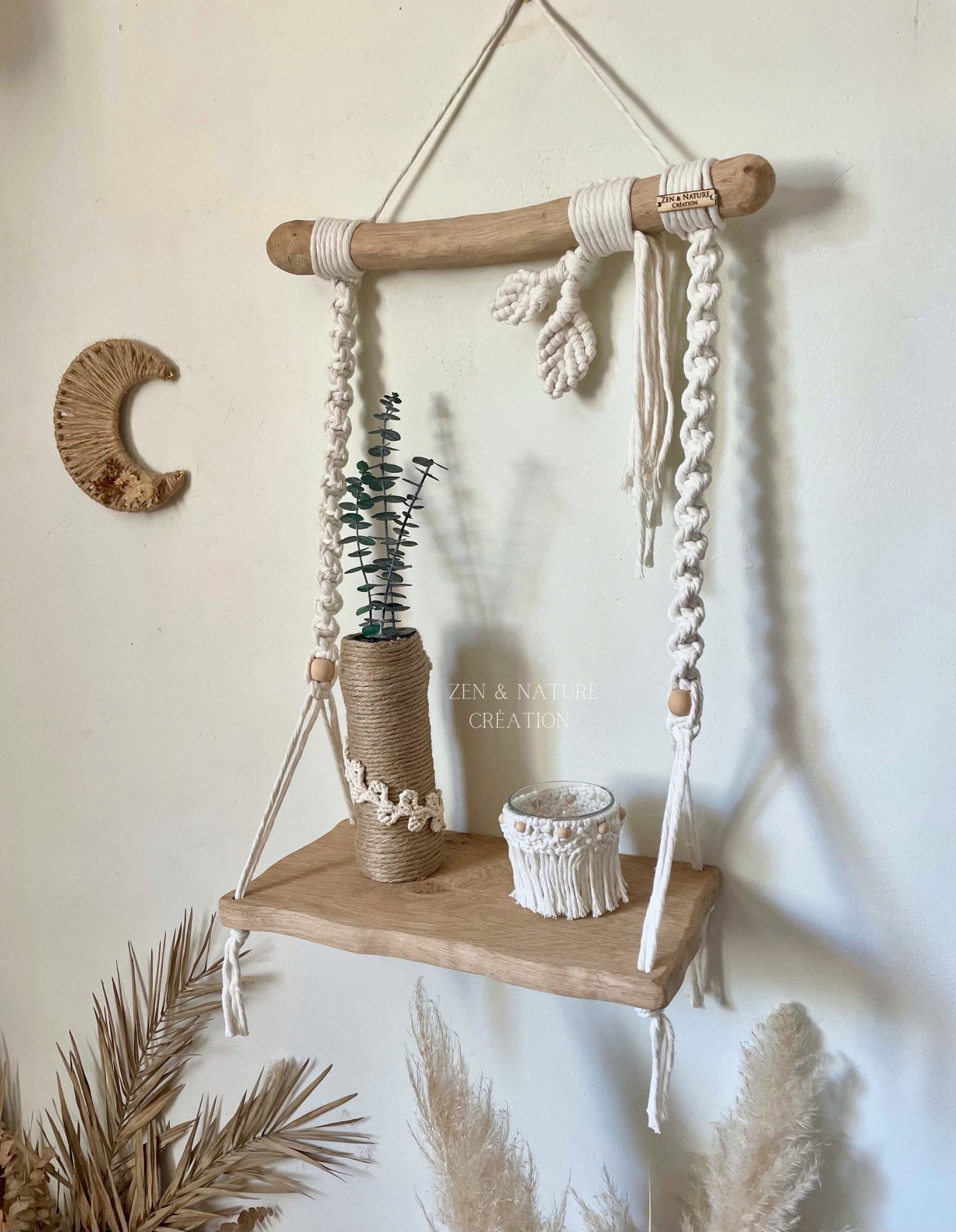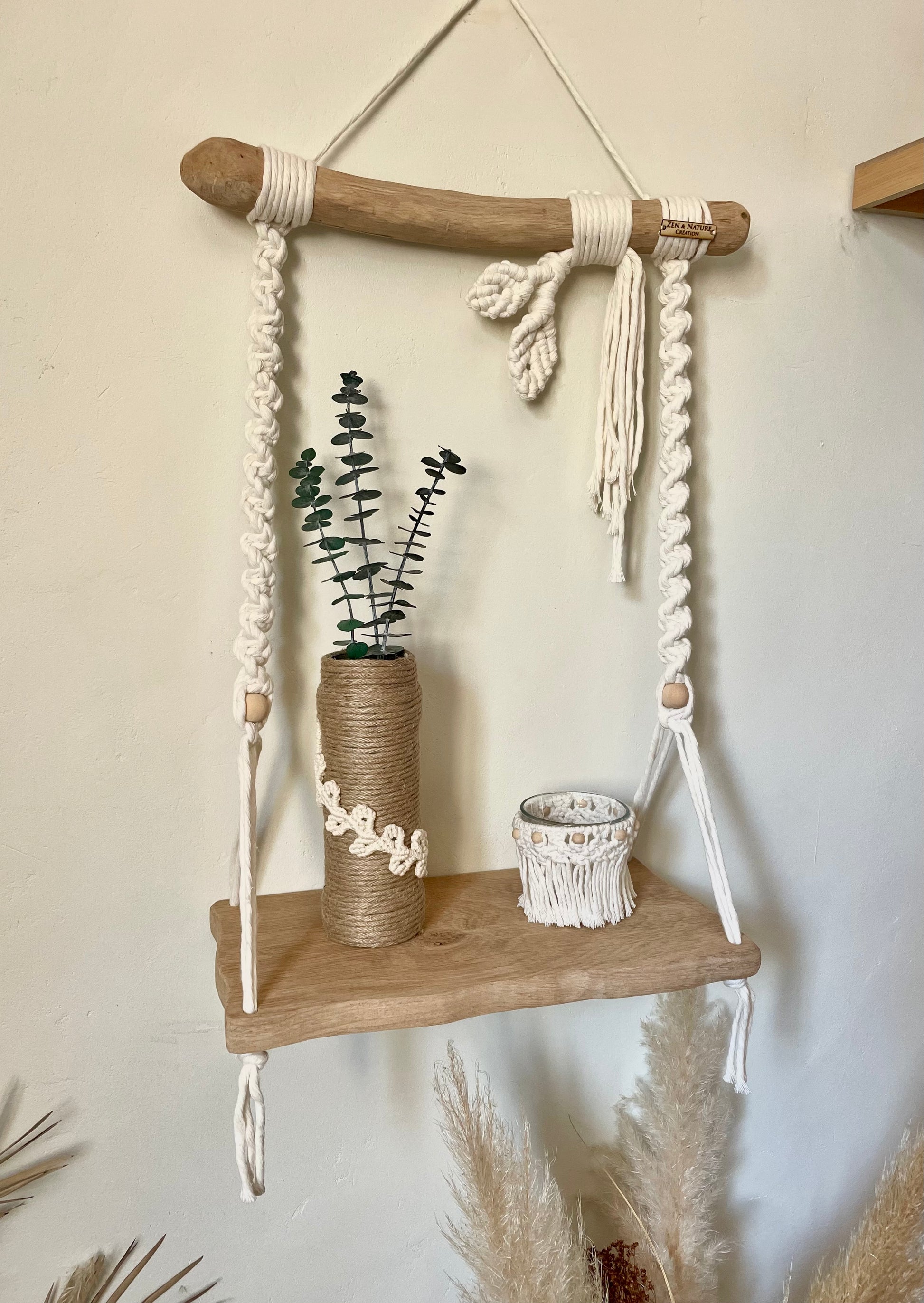 Apportez une touche bohème et naturelle à votre intérieur avec cette élégante étagère suspendue en macramé. À la fois fonctionnelle et décorative, elle est idéale pour exposer vos plantes, bougies, cadres ou objets fétiches avec charme et légèreté.