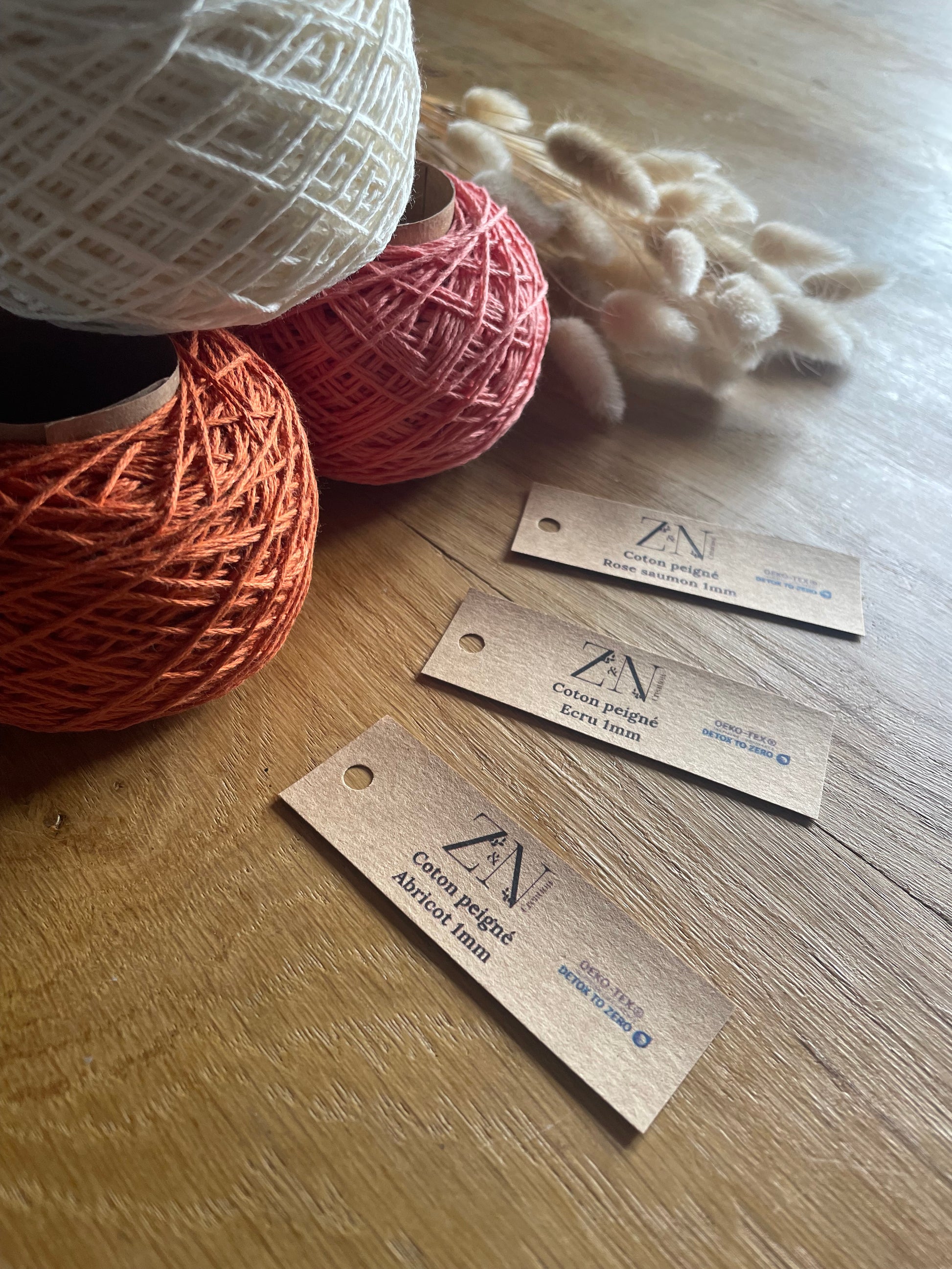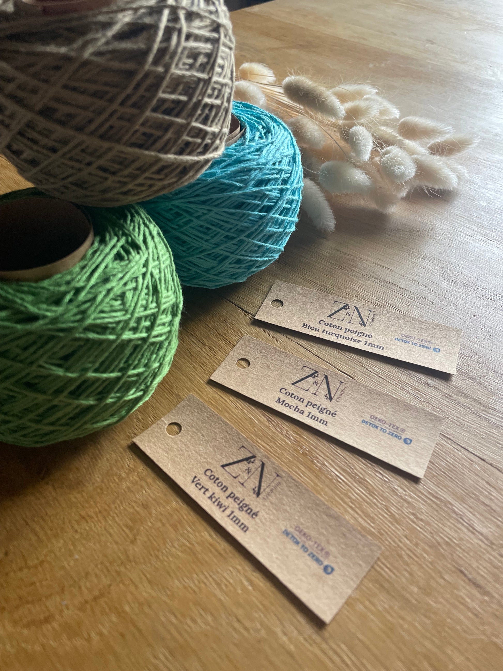 Pelotes artisanales de cordes de coton peigné diamètre 1mm.