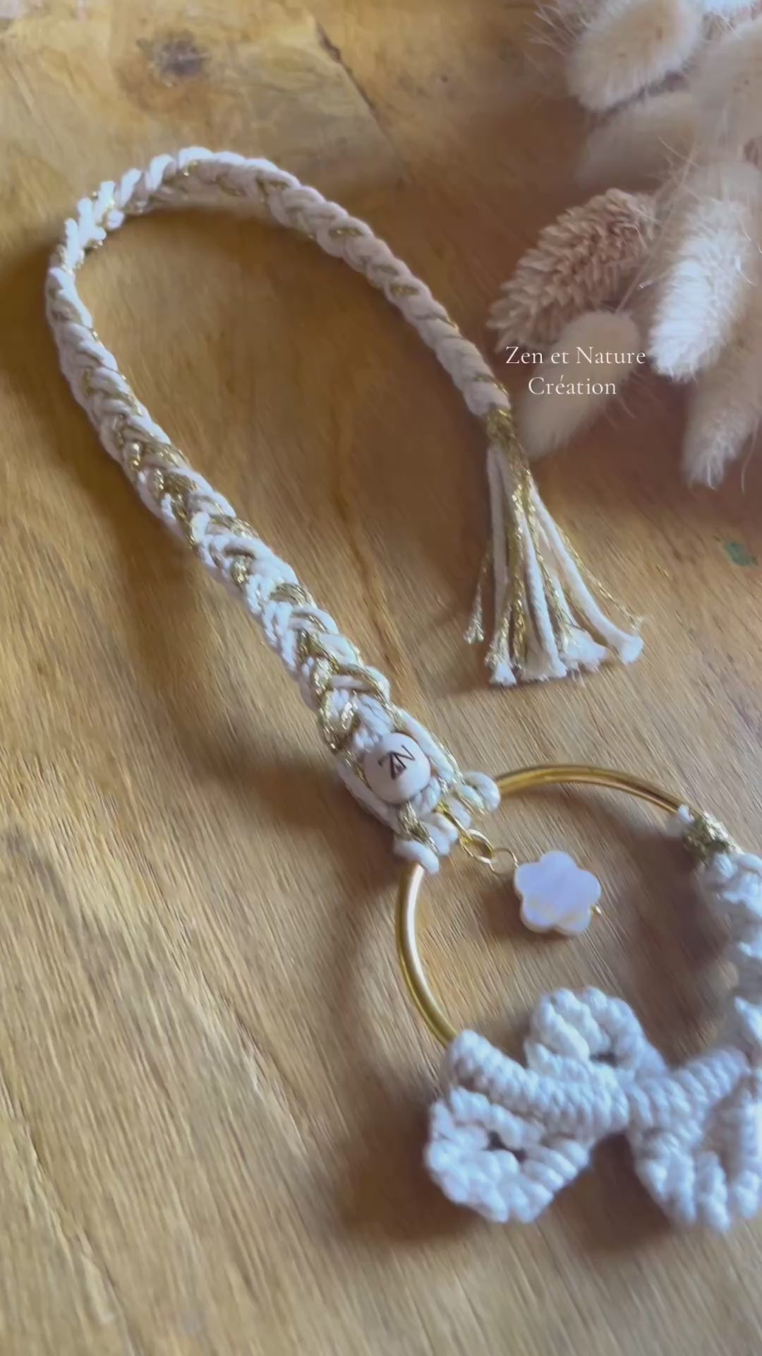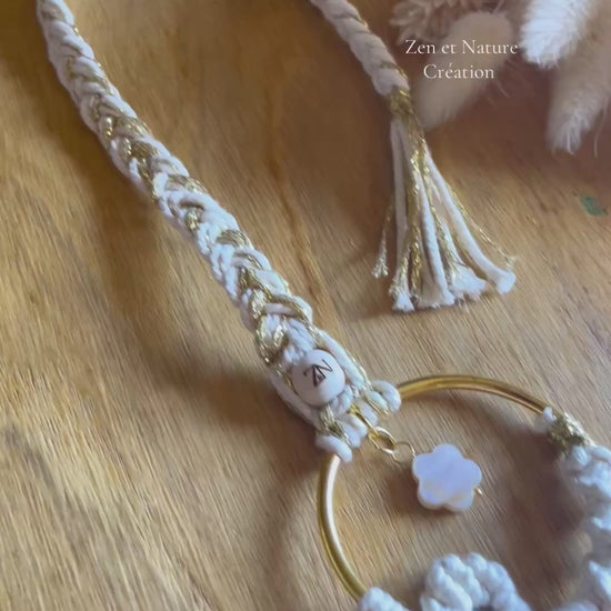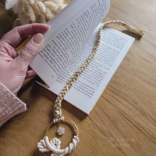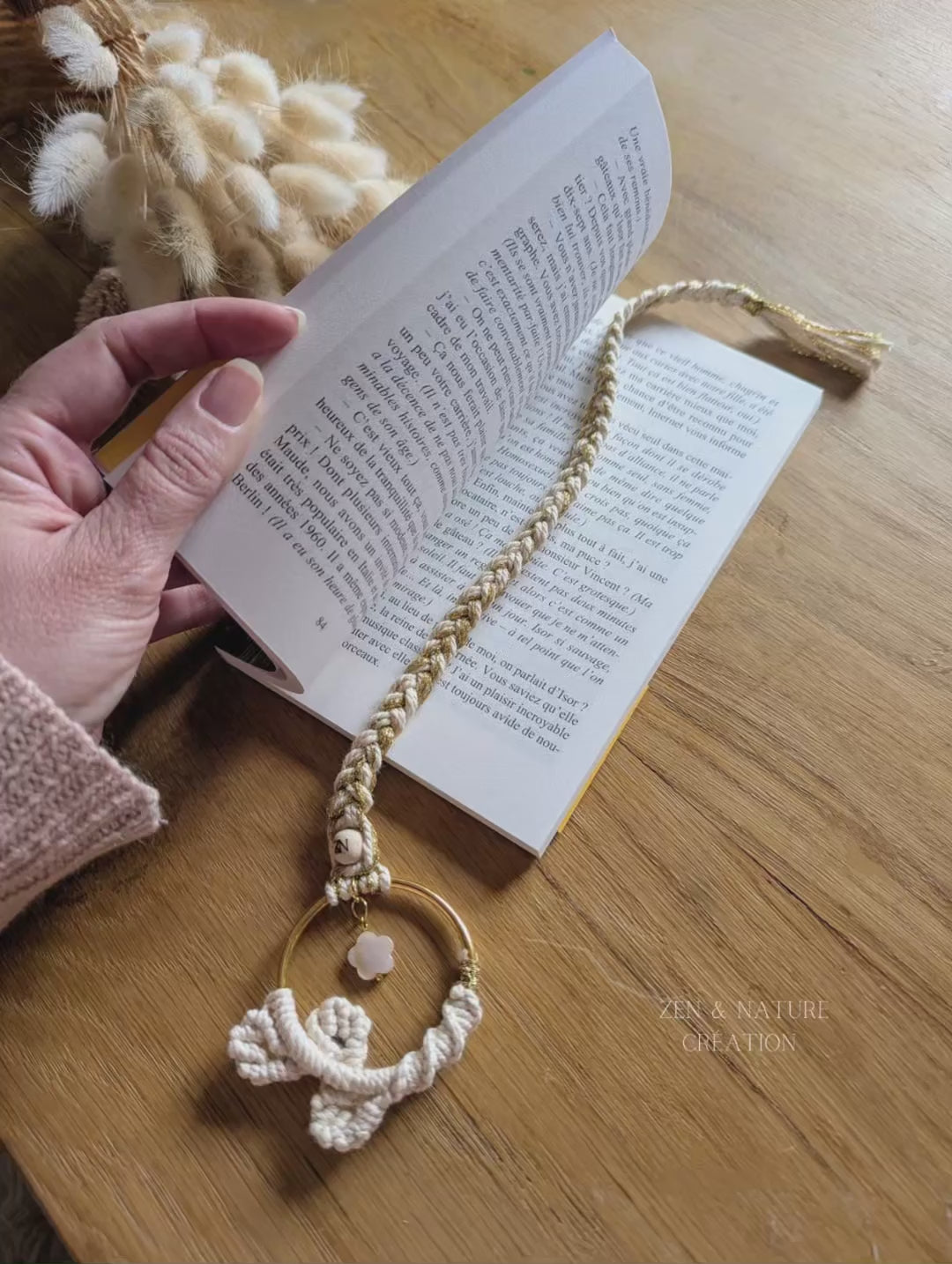 Joli marque-page fait main composé d’un anneau doré orné d’un délicat tissage en macramé et d’un pendentif fleur en nacre.