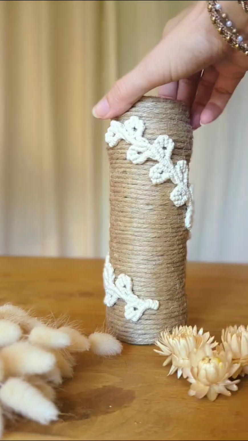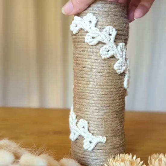 Vase en verre orné de jute naturelle et d'un sublime tissage en macramé pour une décoration naturelle et bohème.